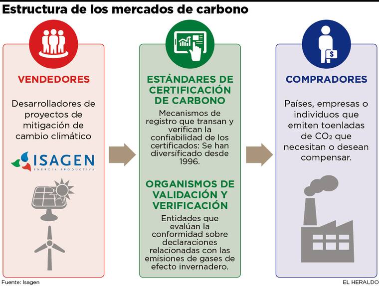 Los mercados de carbono funcionan a partir de desarrolladores de proyectos como vendedores o emisores de los créditos de carbono, de los estándares de certificación organismos de validación y verificación, y compradores.