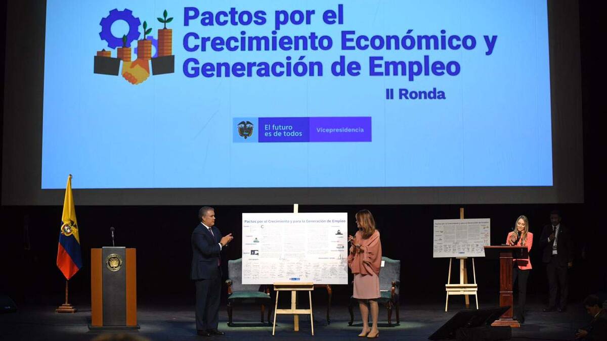 'Ustedes hoy no están firmando solamente un pacto simbólico; están haciendo un compromiso real, fehaciente, que involucra a diez sectores que se suman a doce sectores que ya habían suscrito estos pactos. (...) Son 22 sectores en un pacto nacional para generar más de un millón de empleos, para aportar más de $56 billones al crecimiento de la economía, y para irrigar esos beneficios en toda la sociedad', advirtió el jefe de Estado desde el Teatro Colón, en Bogotá, lugar de la suscripción de los documentos.