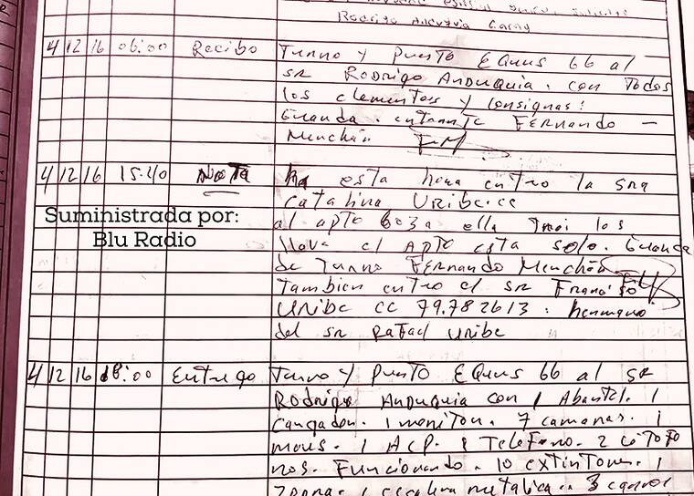 '4/12/16 15:40 Nota: A esta hora entró la señora Catalina Uribe al apto 603, ella tiene llaves. El apartamento está solo. Guarda de turno: Fernando Merchán. También entró el señor Francisco Uribe C.C. 79.782.613, hermano del señor Rafael Uribe', dice la minuta publicada por Blu Radio.