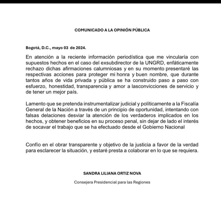 “Lamento que se pretenda instrumentalizar judicial y políticamente a la Fiscalía General de la Nación a través de un principio de oportunidad, intentando con falsas delaciones desviar la atención de los verdaderos implicados en los hechos, y obtener beneficios en su proceso penal, sin dejar de lado el interés de socavar el trabajo que se ha efectuado desde el Gobierno nacional”, se lee en un comunicado compartido por Ortiz.