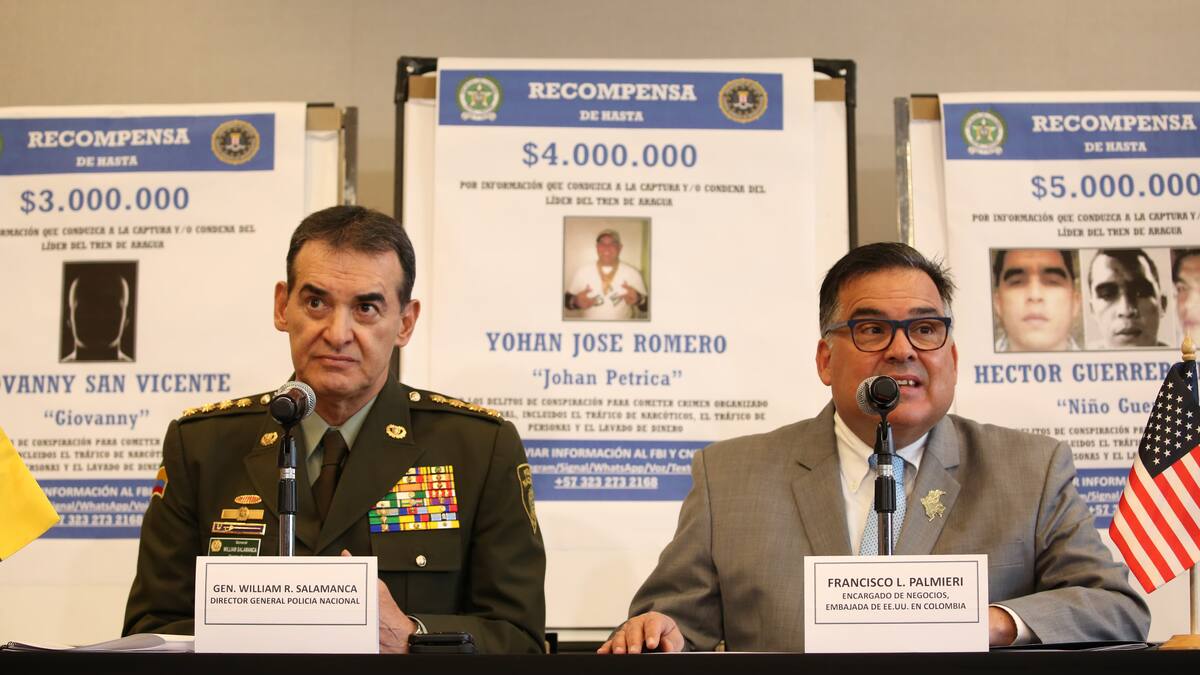 El general William René Salamanca, director de la Policía Nacional, y Francisco Palmieri, encargado de negocios de la embajada de Estados Unidos en Colombia, dieron detalles este jueves 11 de julio del ofrecimiento de unas millonarias recompensas en dólares para quienes entreguen información de tres cabecillas de la organización criminal transnacional Tren de Aragua que, aparentemente, se moverían por territorio colombiano.