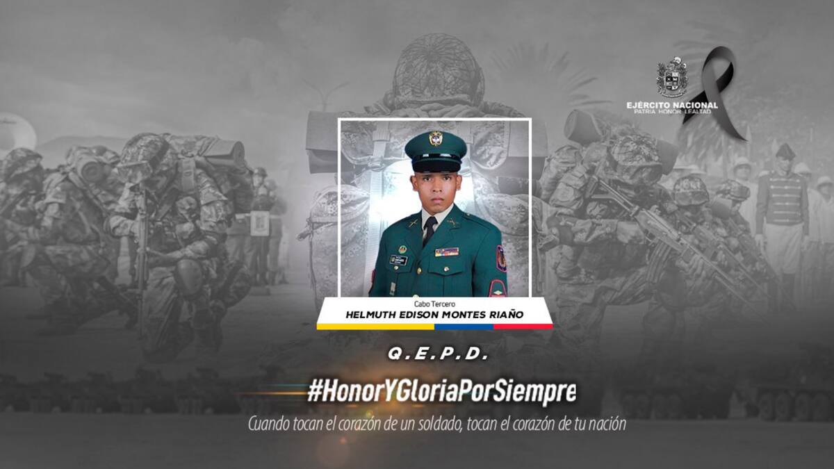 Este sábado, el soldado Helmuth Edison Montes Riaño murió luego de caer en un campo minado, tras la activación de un artefacto en zona rural de Zaragoza, Bajo Cauca antioqueño.