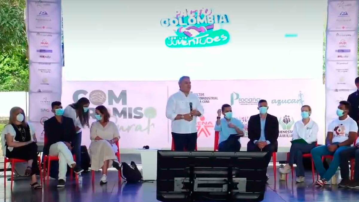 El presidente Iván Duque lanzó este sábado en Tuluá, Valle del Cauca, el programa de Compromiso Rural, en el marco del Pacto Joven, con el que aspira a crear 1.500 empleos para jóvenes rurales de los departamentos del Valle del Cauca, Cauca y Risaralda.
