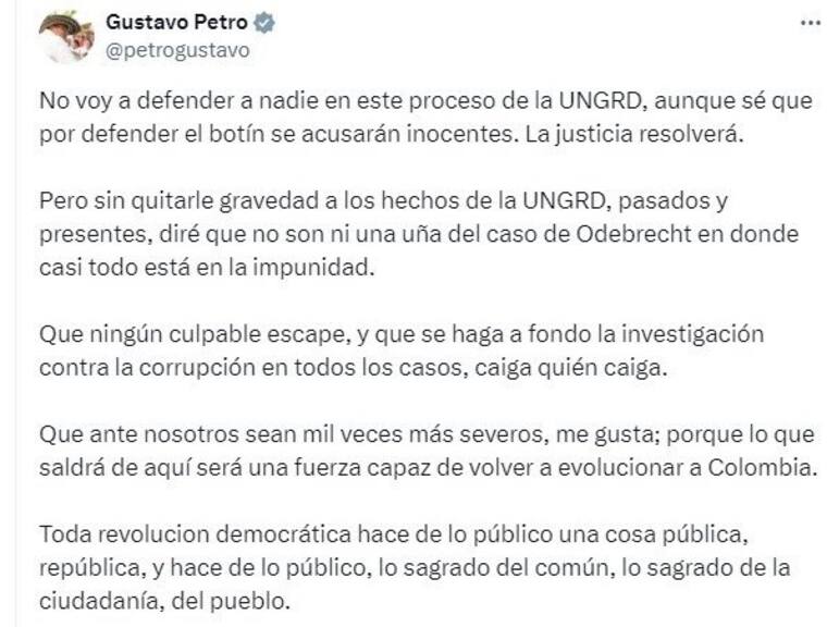 'No voy a defender a nadie en este proceso de la UNGRD, aunque sé que por defender el botín se acusarán inocentes. La justicia resolverá', sostuvo el jefe de Estado.