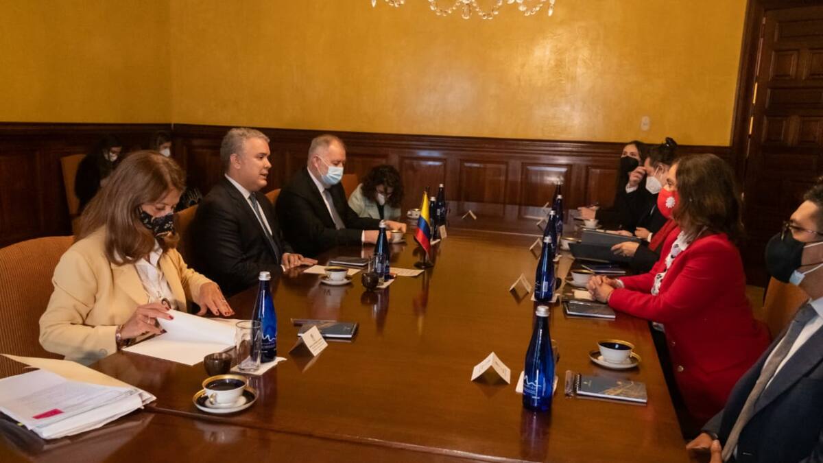 El encuentro se produce en la sede de la Cancillería y acompañan al jefe de Estado la vicepresidenta y canciller, Marta Lucía Ramírez; el embajador de Colombia ante la OEA, Alejandro Ordóñez, y la consejera presidencial para los Derechos Humanos, Nancy Patricia Gutiérrez.
