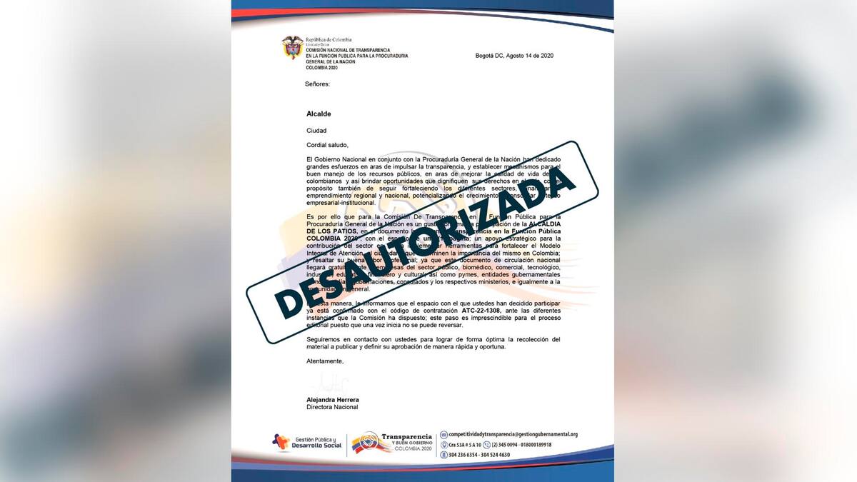 A través de su cuenta en Twitter, la Procuraduría desautorizó el uno del nombre de la entidad para realizar este tipo de actividades, así como también desmintió tener vínculos con la llamada Comisión De Transparencia en la Función Pública para la Procuraduría General de la Nación.