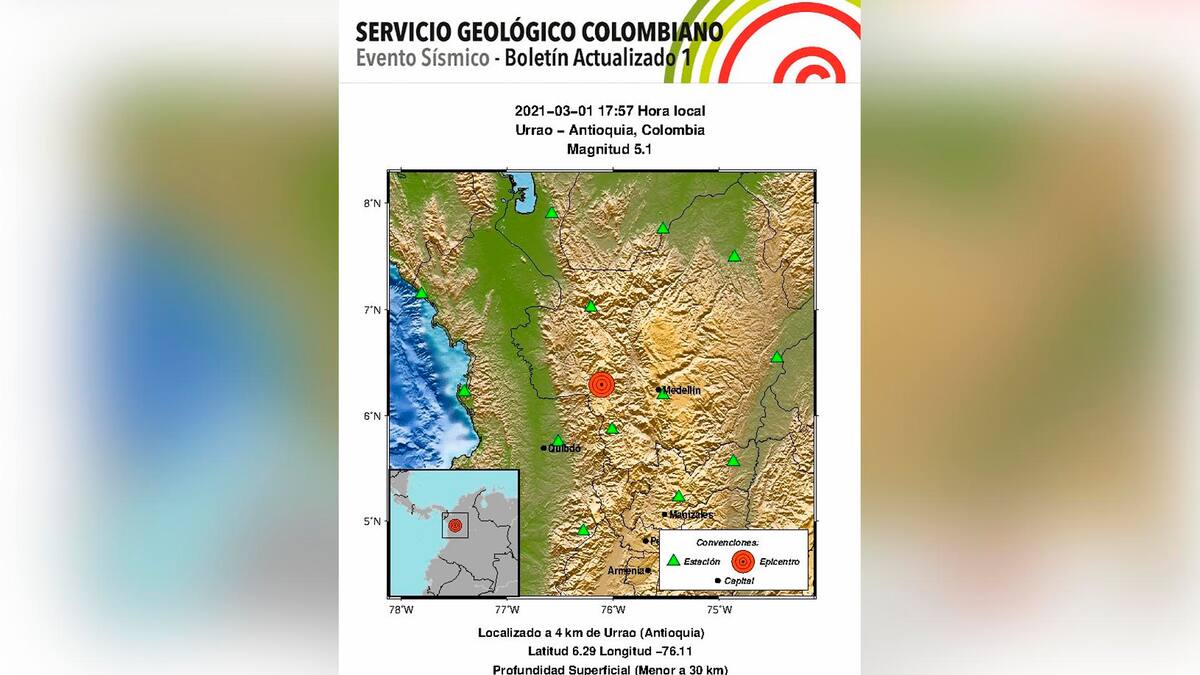En la tarde de este lunes el Servicio Geológico Colombiano, reportó un sismo de magnitud 5.1, con una profundidad superficial menor a 30 Km, con epicentro en Urrao, Antioquia.