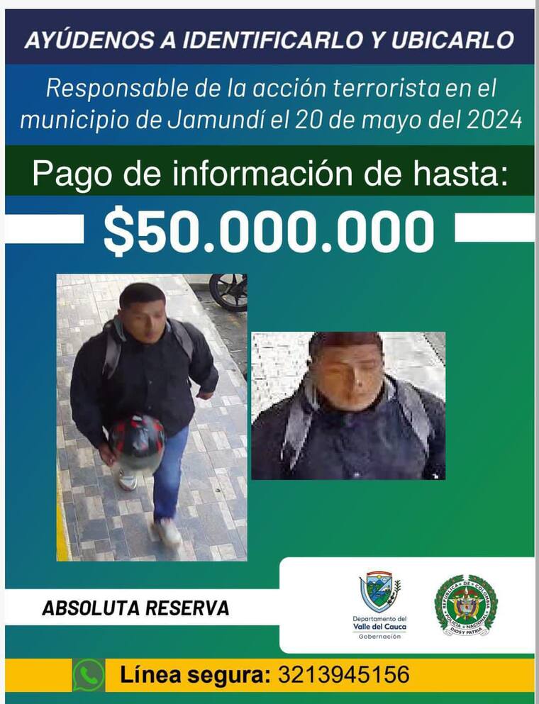 Las autoridades del Valle del Cauca revelaron la imagen del presunto autor material del atentado con 'motobomba' perpetrado este lunes 20 de mayo en Jamundí, hecho que dejó 13 personas heridas.