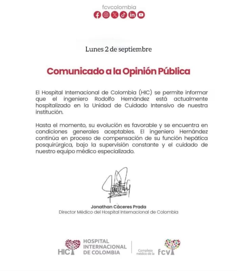 “El ingeniero Rodolfo Hernández Suárez está actualmente hospitalizado en la Unidad de Cuidados Intensivos de nuestra institución. Hasta el momento su evolución es favorable y se encuentra en condiciones generales aceptables”, dijo Jonathan Cáceres Prada, director médico del HIC.