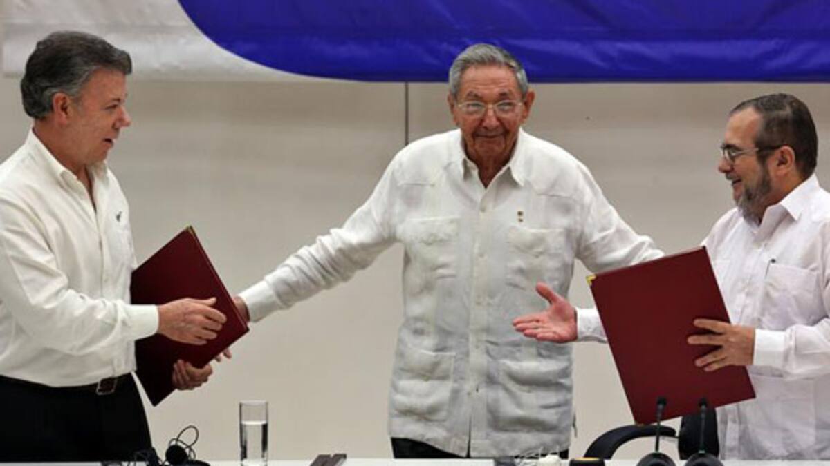El presidente de Cuba, Raúl Castro, entregó el documento a su homólogo colombiano y al líder de las Farc, Timochenko, quienes se estrecharon las manos bajo el aplauso de los asistentes.