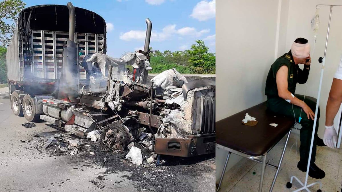 El mayor Sergio Saavedra registra quemaduras en el rostro y extremidades; al igual que los patrulleros José Omar Páez y Ferney Henao, quienes fueron trasladados al hospital de Aguachica; mientras que el teniente Jeorgy Pabón, el intendente Iván Almanza y el patrullero Juan Padilla sufrieron lesiones leves, según informó la Policía.