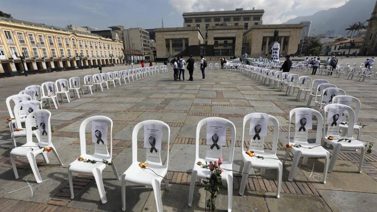 Médicos colombianos pusieron este lunes 165 sillas en la Plaza de Bolívar de Bogotá, centro del poder del país, para recordar al personal sanitario que ha muerto por la pandemia de la covid-19 y para protestar contra un proyecto de reforma a la salud que tramita el Congreso.