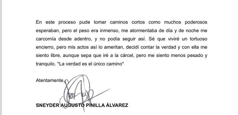 Tal y como lo había dicho en otras ocasiones, en la carta Sneyder Pinilla reconoció que hizo parte de una 'estructura criminal'.