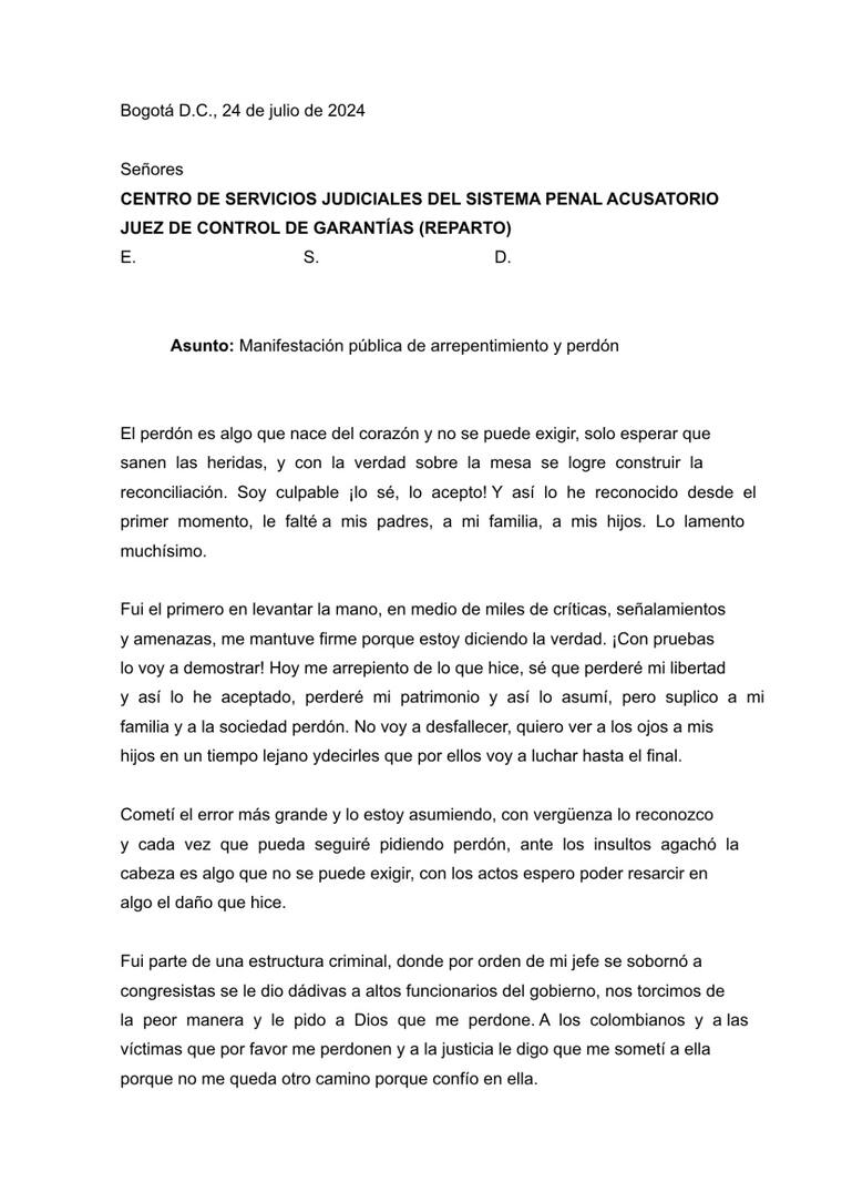 'Fui parte de una estructura criminal, donde por orden de mi jefe se sobornó a congresistas, se le dio dádivas a altos funcionarios del gobierno, nos torcimos de la peor manera y le pido a Dios que me perdone', dice un aparte de la carta dirigida al Centro de Servicios Judiciales del Sistema Penal Acusatorio.