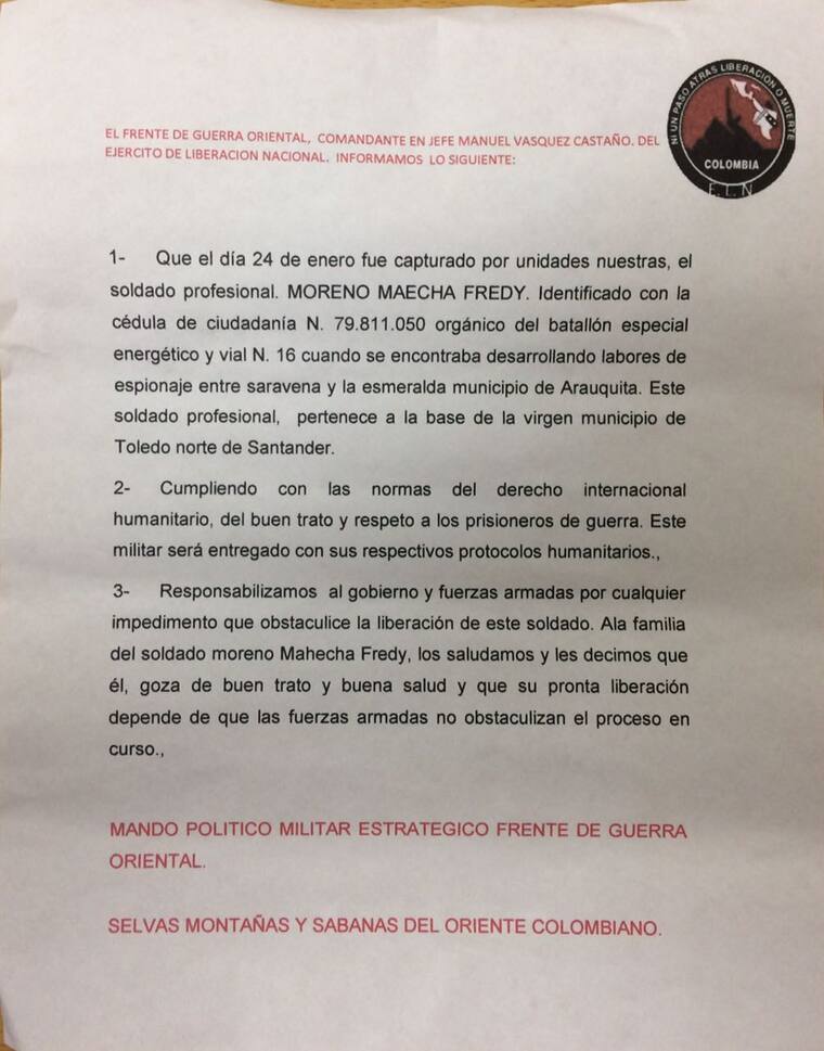 La guerrilla sostiene en el documento que Moreno Mahecha fue secuestrado 'mientras realizaba labores de espionaje entre Saravena y La Esmeralda, en el municipio de Arauquita'. No obstante, agregan que 'será liberado con los respectivos protocolos humanitarios cumpliendo con las normas del derecho internacional'.