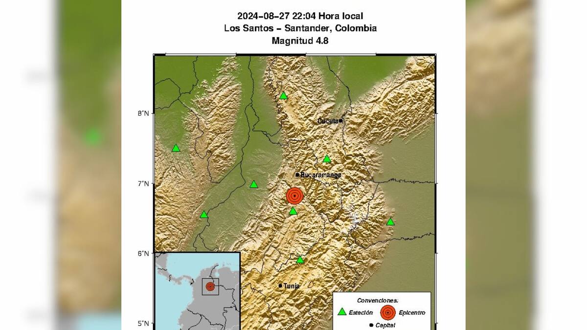 El Servicio Geológico Colombiano reportó un temblor en la noche de este martes 27 de agosto, de magnitud 4.8, con epicentro en Los Santos, Santander.