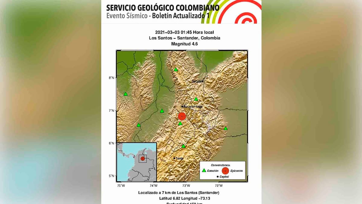 Según el reporte del Servicio Geológico Colombiano, el primer movimiento telúrico, de magnitud fue de 4.6 y una profundidad de 150 km, se produjo a las 1:45 de la madrugada en Los Santos, Santander.