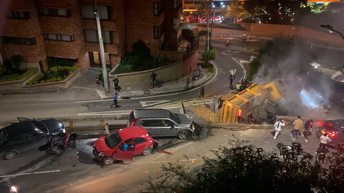 Un camión tipo volqueta que se movilizaba sobre la Vía Circunvalar de Bogotá embistió a tres vehículos y se volcó sobre un taxi que circulaba por el sector.