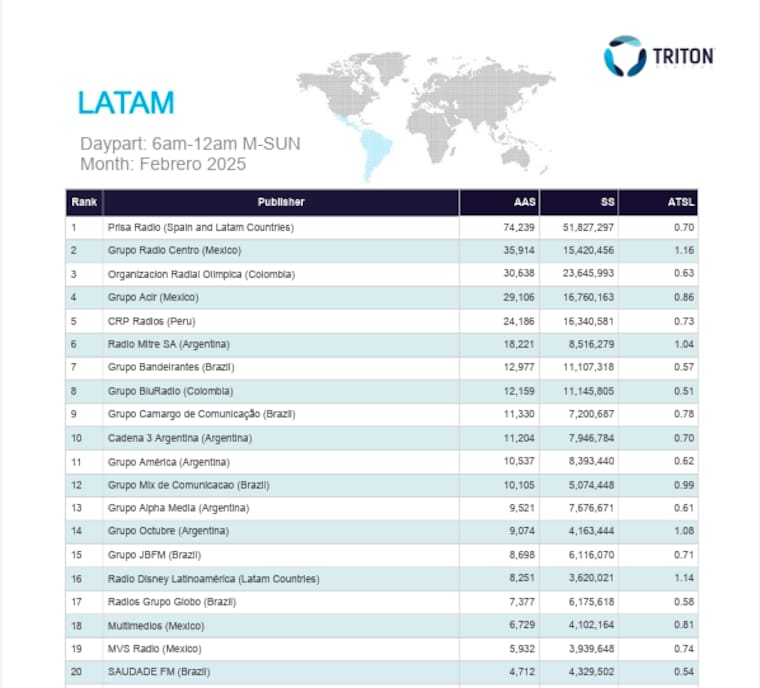 El reconocimiento de Triton, que analiza el consumo de audio en línea en todo el mundo mediante métricas como sesiones activas promedio y tiempo de escucha, posiciona a Olímpica Stereo en la cima del streaming radial latinoamericano. La cadena refuerza así su liderazgo también en el ámbito digital, a través de su sitio web y su aplicación móvil.