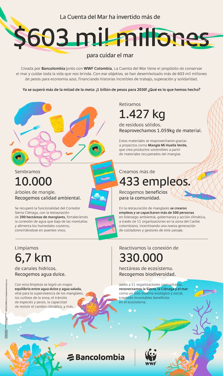 La Cuenta del Mar, iniciativa creada por Bancolombia, continúa consolidándose como uno de los programas de conservación marina más importantes del país. A través de esta misma línea, Bancolombia ha desembolsado más de $603 mil millones, recursos propios destinados a impulsar proyectos que favorecen la sostenibilidad hídrica y la economía azul. De manera complementaria, el trabajo conjunto con WWF Colombia como aliado ha permitido desarrollar procesos de restauración, fortalecimiento de liderazgos locales y otras acciones de conservación.