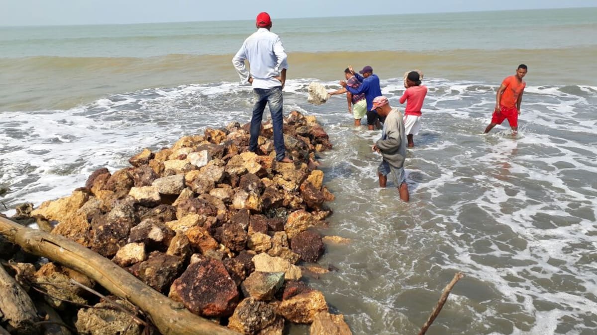 Frente a la acelerada erosión marina que ha desaparecido diez viviendas en la última década y hasta parte del cementerio, los habitantes del corregimiento Bahía Rada, en Moñitos, Córdoba, desarrollan por estos días una ‘piedratón’, para armar con ingeniería nativa sus propias barreras y disminuir la fuerza del raudo mar Caribe.