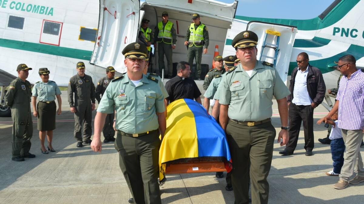 En un costado de la pista, en la terminal aérea, se hizo la recepción de la corte fúnebre por parte de los familiares y oficiales de la Policía de Córdoba y la Policía Metropolitana, quienes se encargaron de rendir los honores respectivos al cadete, víctima del ataque terrorista en la Escuela General Santander, que cobró la vida de otras 20 personas, incluido uno de los autores materiales.