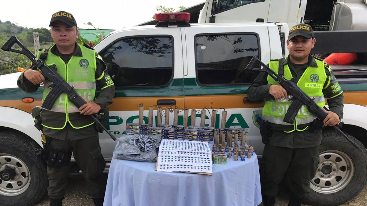 Las incautaciones realizadas por los uniformados son amparadas por el Código Nacional de Seguridad y Convivencia, (Ley 1801 de 2016, Art. 30 numeral 1). 'Fabricar, tener, portar, almacenar, distribuir, transportara, comercializar, manipular o usar artículos pirotécnicos, fuegos artificiales, pólvora o globos sin el permiso de los requisitos establecidos en la normatividad vigente'.