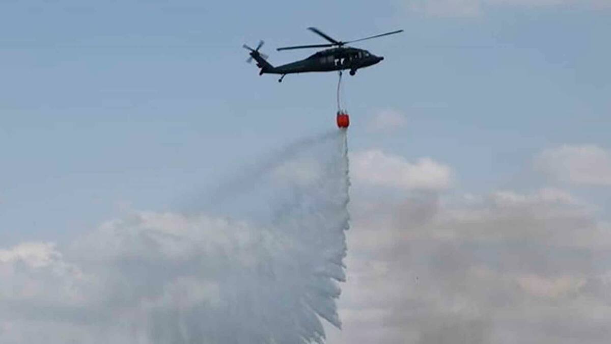 En el lugar, el helicóptero con sistema Bambi Bucket, enviado por el Ministerio de Defensa, apoya en su segundo día de labores de mitigación del fuego.
