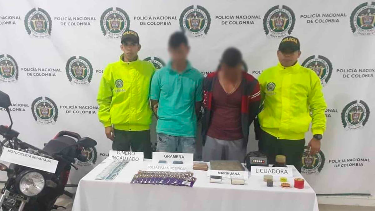 'Es así como se logró la captura de dos hombres de 21 y 25 años y la incautación de 1.020 gramos de marihuana dosificada, avaluada en más de $3 millones, una licuadora, cinco máquinas trituradoras, 30 mil pesos en efectivo, producto de la venta de la droga; y otros elementos para su empaque o dosificación', sostuvo el alto oficial.