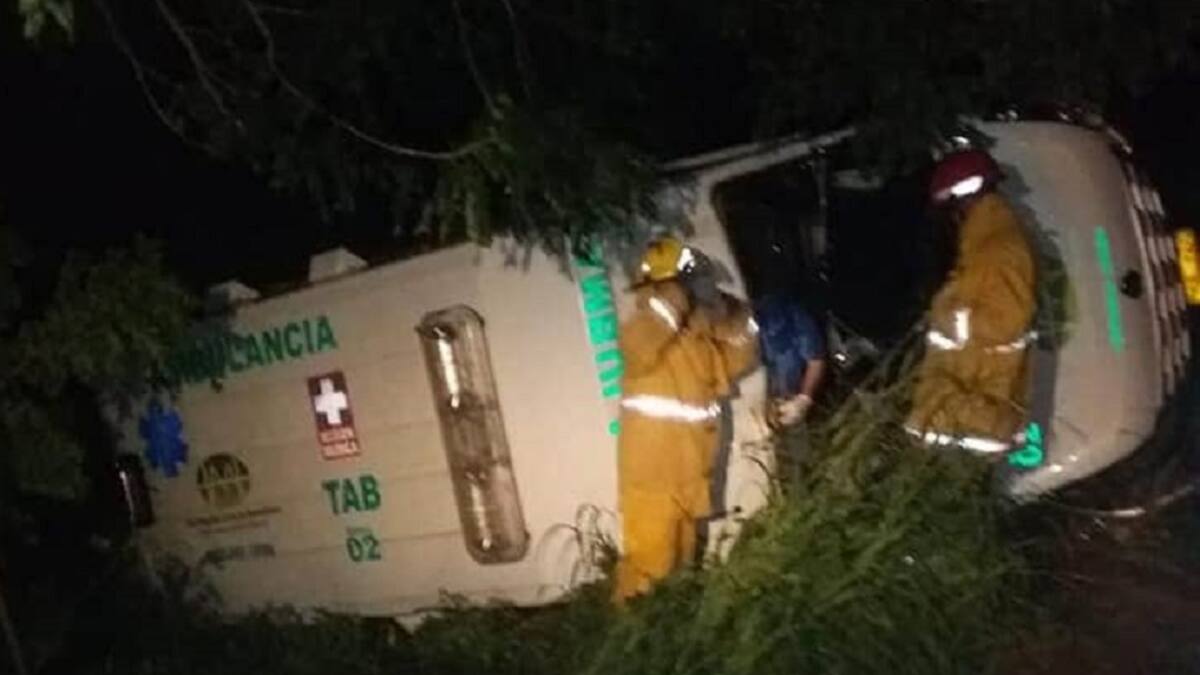 Volcada a un costado de la carretera quedó la ambulancia adscrita al hospital del municipio de Montelíbano, tras sufrir un aparatoso accidente.