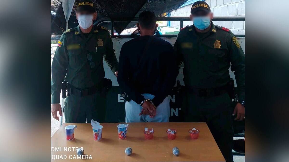 El alto oficial continuó diciendo que 'la persona capturada es un ciudadano de 28 años de edad, natural de Montería, quien llegó con el pretexto de llevar una encomienda a uno de los capturados, es ahí donde se realiza el respectivo registro al sujeto y a los elementos que trataba de ingresar, encontrado tres bolas de marihuana, camufladas en vasos de yogur con un peso de 175 gramos aproximadamente'.