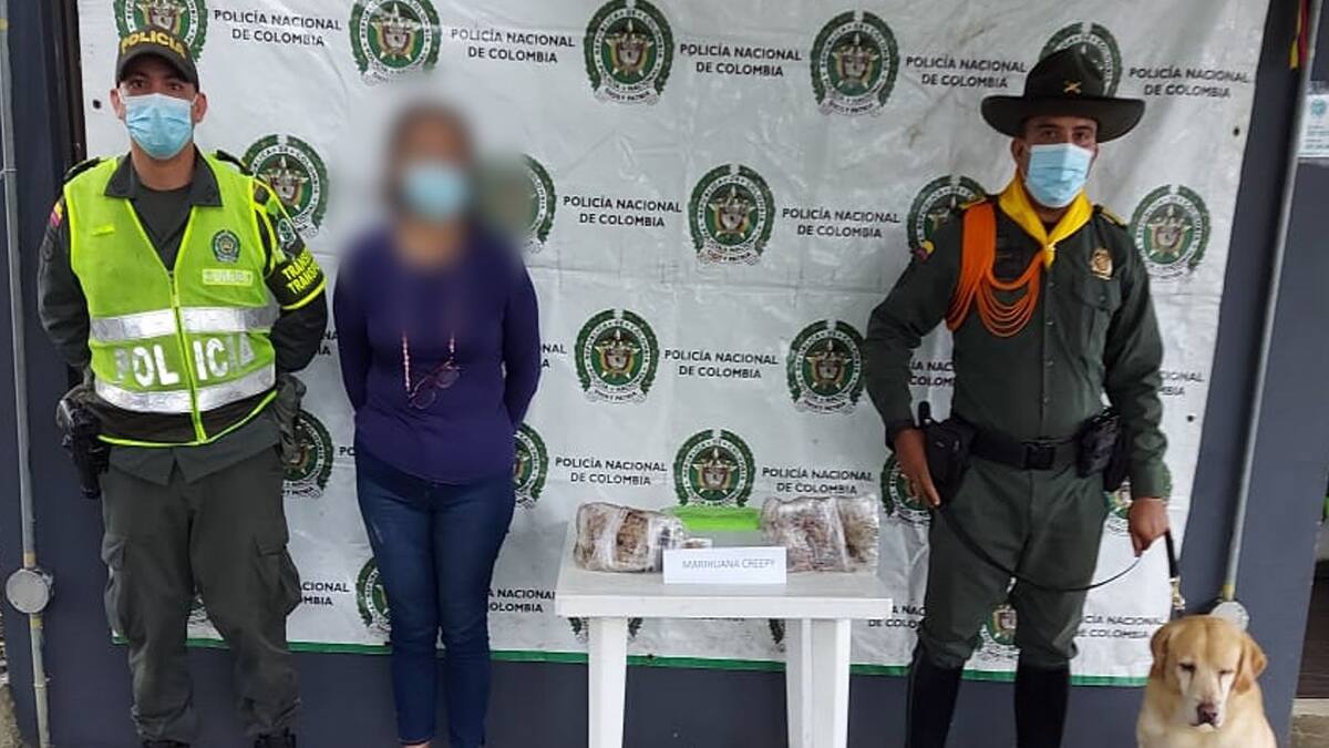 'Nuestro agente canino ‘Lincon’ ubicó el estupefaciente en la bodega de un vehículo afiliado a una reconocida empresa. Fue de esta manera como, ante las señales de nuestro héroe de cuatro patas, los uniformados hallaron entre las pertenencias de la mujer, dos paquetes de una sustancia vegetal de características similares a la marihuana tipo Cripy, con un peso de 1.000 gramos y listos para ser comercializados', dijo.