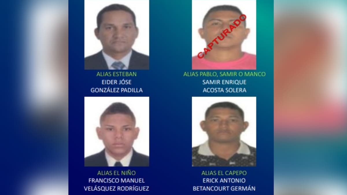 Los hombres reseñados fueron identificados como Eider José González Padilla, alias Esteban; Francisco Manuel Velásquez Rodríguez, alias el Niño; Erick Antonio Betancourt Germán, alias el Capepo; y Samir Enrique Acosta Solera, alias Pablo, ‘Samir’ o ‘Manco’, quien figura como capturado.