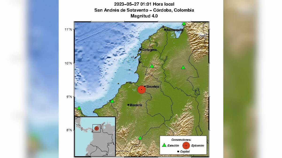 De acuerdo al Servicio Geológico Colombiano, un nuevo sismo, de magnitud 4.0 grados, se presentó en Colombia en la madrugada de este sábado 27 de mayo, con epicentro en el municipio de San Andrés de Sotavento, en el departamento Córdoba y límites con Sucre.