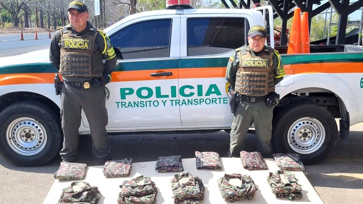 En un camión y bajo la modalidad de encomienda eran transportados 5 pantalones camuflados pixelados y 12 cintelas tácticas pixeladas que fueron incautados por unidades de la Seccional de Tránsito y Transporte del Departamento de Policía Córdoba.