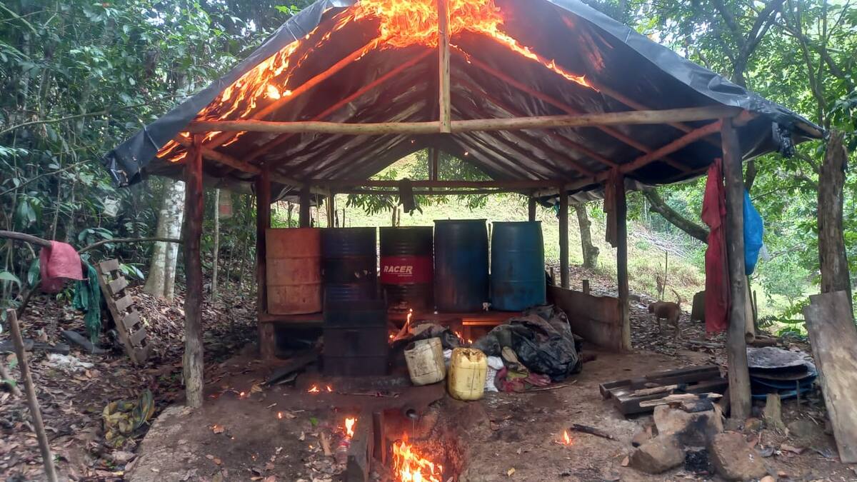 En esos sectores ubicaron los dos complejos ilegales construidos de manera artesanal, que contenían 130 galones de pasta de base de coca en proceso, 245 galones de gasolina, 15 canecas, 2 prensas y 115 galones de ACPM, entre otros elementos e insumos líquidos y sólidos para la fabricación del estupefaciente que aportaría una renta mensual de 150 millones de pesos por los 46 kilogramos de pasta base de coca que produce.