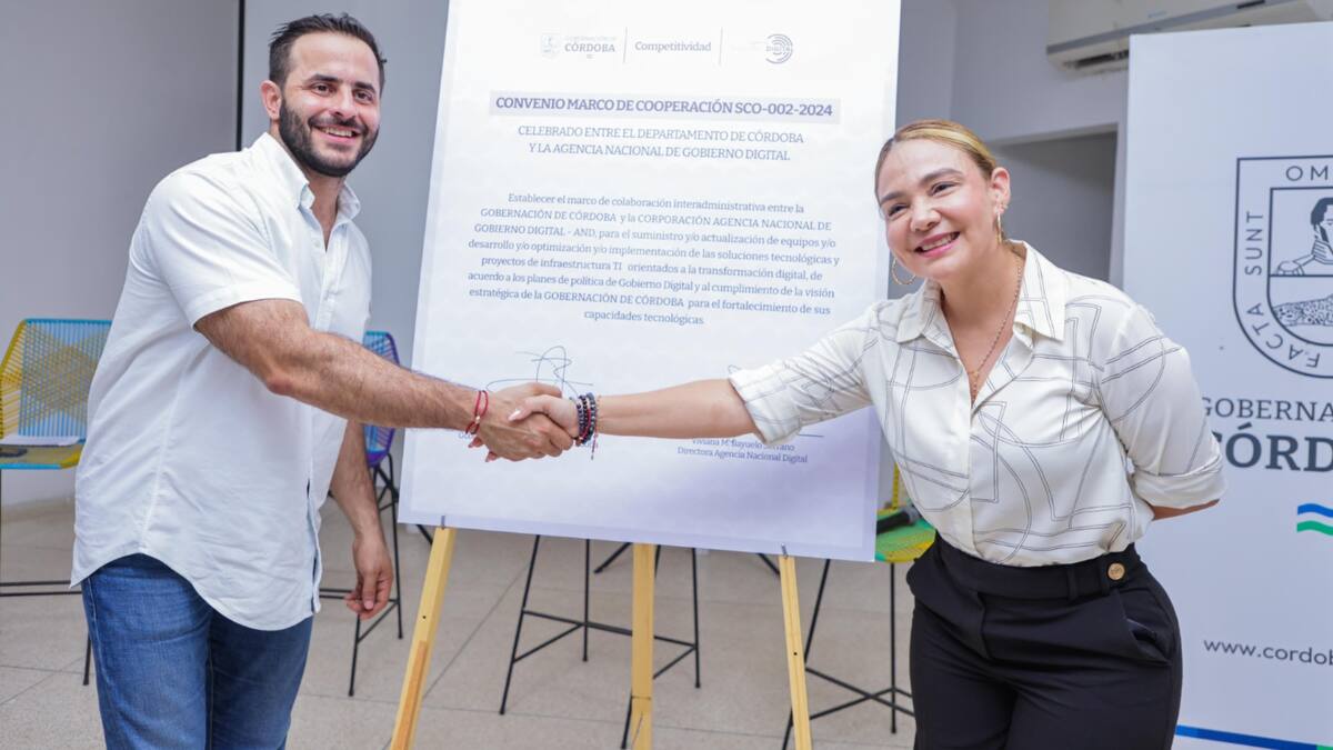 El gobernador Erasmo Zuleta Bechara y la directora de la Agencia Nacional Digital, Viviana Bayuelo Serrano, firmaron el convenio de colaboración interadministrativa “que nos permitirá suministrar y actualizar equipos, así como desarrollar, optimizar e implementar soluciones tecnológicas y proyectos de infraestructura TIC, orientados a la transformación digital. Con este convenio, avanzamos en la política de Gobierno Digital y fortalecemos nuestras capacidades tecnológicas en beneficio de toda la comunidad”, indicó el mandatario de los cordobeses.