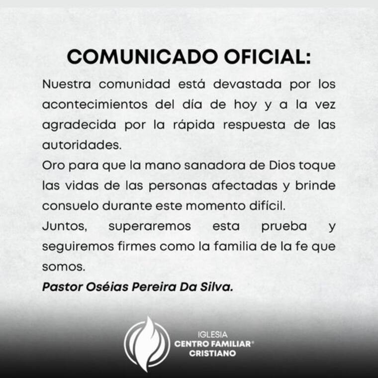 El líder del templo evangélico aseguró que “nuestra comunidad está devastada por los acontecimientos del día de hoy (ayer domingo) y a la vez agradecida por la rápida respuesta de las autoridades”.