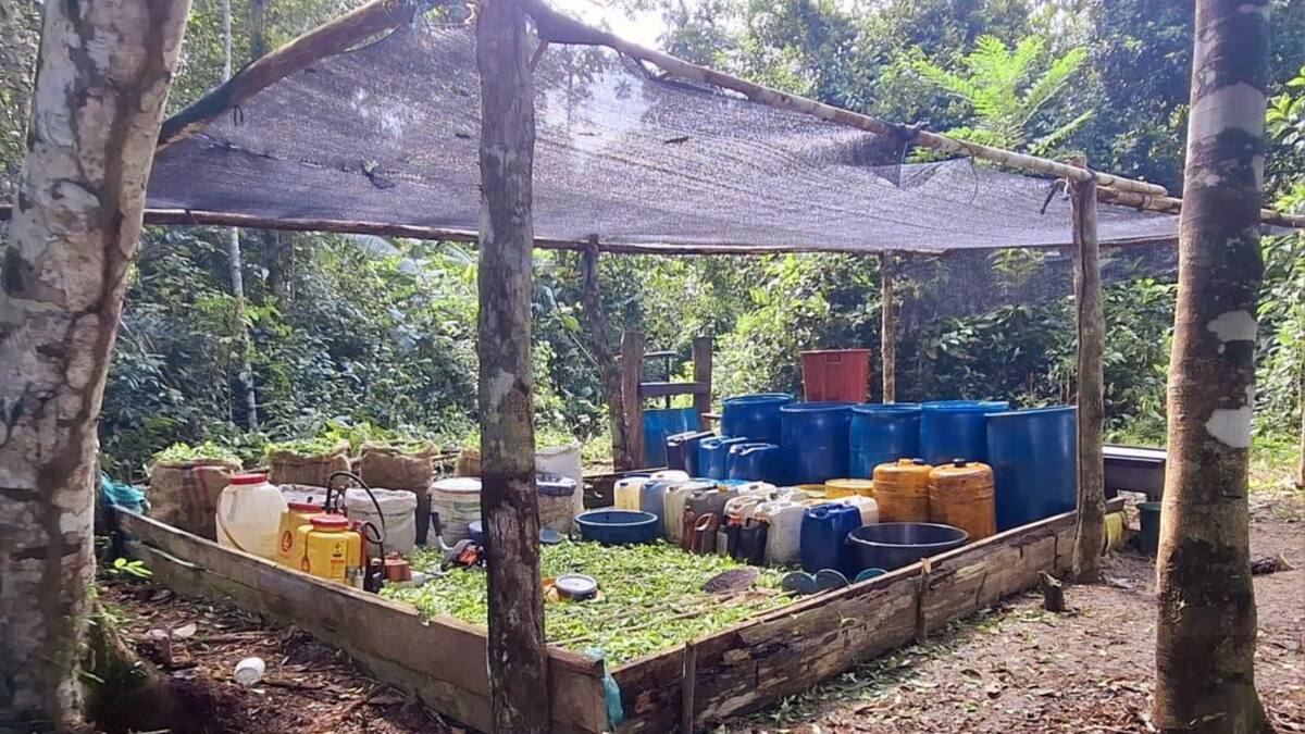 Estos laboratorios estaban construidos de manera artesanal y contenían grandes cantidades de insumos líquidos y sólidos para la producción del alcaloide. Entre el material ubicado e incautado están 860 galones de pasta base de coca en solución, 1.680 kilos de hoja de coca raspada, 64 canecas, 50 galones de gasolina, 130 kilos de cemento, cal, ACPM, amoniaco, urea, palas metálicas y rastrillos.