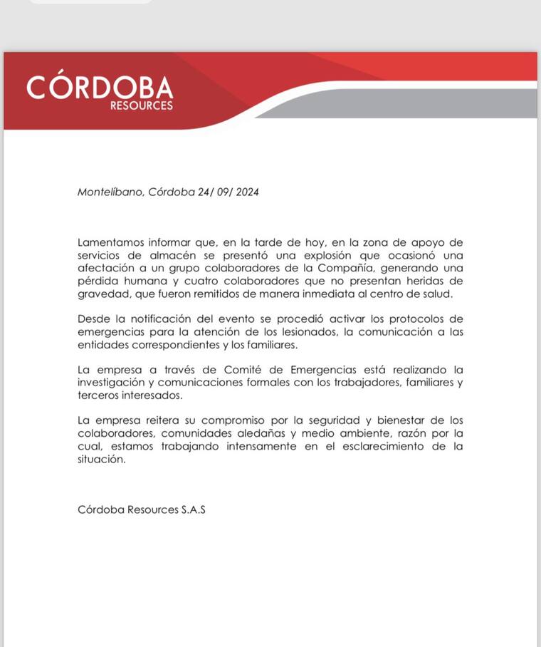 Un operario de la empresa minera Córdoba Resources, que está ubicada en el municipio de Puerto Libertador, murió la tarde de este martes 24 de septiembre, tras una explosión que se registró en la zona de almacén.