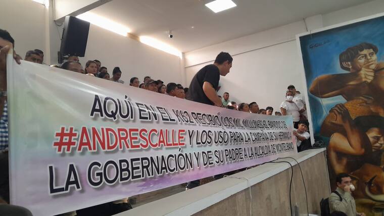 Poco antes de las 9:00 de la mañana de este martes 19 de noviembre cuando Calle Aguas y su equipo de trabajo, entre ellos del área de comunicaciones y prensa, arribó al salón de sesiones de la duma, se encontró con que en las barras lo esperaban varias pancartas que hacen alusión a los señalamientos de presunto ingreso de los dineros de la Unidad Nacional de Gestión del Riesgo de Desastres (Ungrd) a su campaña a la gobernación de Córdoba, que perdió, y a la alcaldía de Montelíbano que ganó su padre.