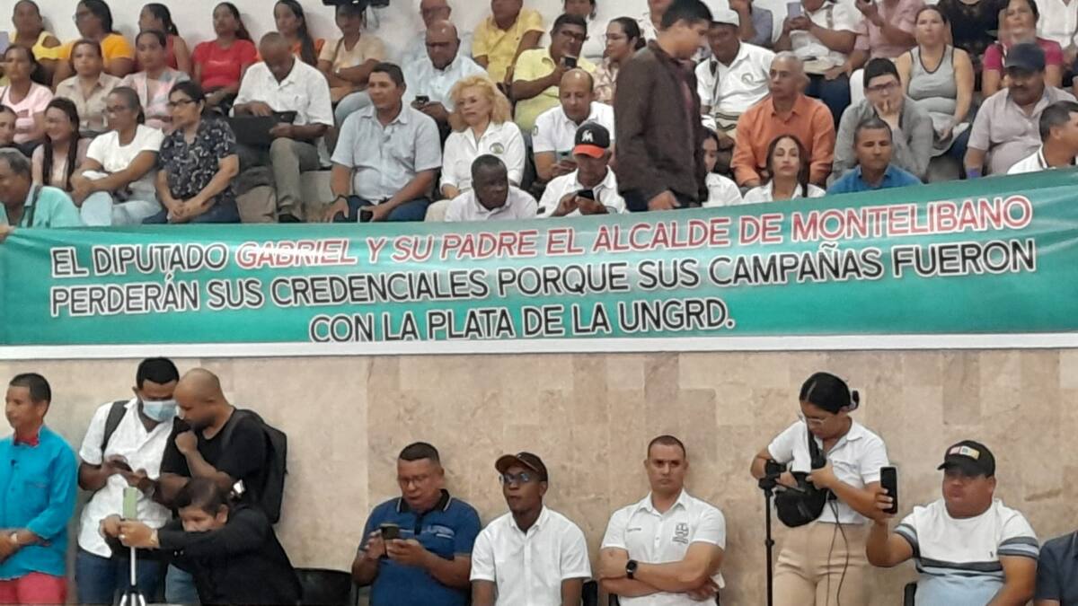 “El diputado Gabriel y su padre el alcalde de Montelíbano perderán sus credenciales porque sus campañas fueron con la plata de la UNGRD” y “Aquí en el K62 recibió los mil millones el bandido de #ANDRES CALLE y los usó para la campaña de su hermano a la Gobernación y de su padre a la Alcaldía de Montelíbano”, son algunos de los mensajes de las pancartas que llevaron los ciudadanos a la sesión de la Asamblea de Córdoba en la mañana de este mates 19 de noviembre.