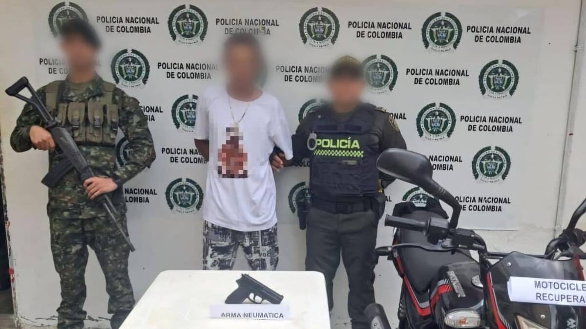La captura fue derivada porque este, minutos antes, intimidó con el arma, que resultó ser traumática, a un ciudadano para hurtarle su motocicleta en esta subregión del San Jorge.