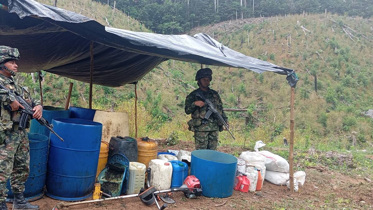 “Estas estructuras, construidas de forma artesanal escondían un total de 69 canecas, 535 kilos de hoja de coca, 410 galones de pasta base de coca en proceso, 538 galones de gasolina, 901 galones de ACPM, 5 prensas, cal, cemento y amoniaco, entre otros elementos e insumos líquidos y sólidos“, reportó la Décimo Primera Brigada del Ejército Nacional.