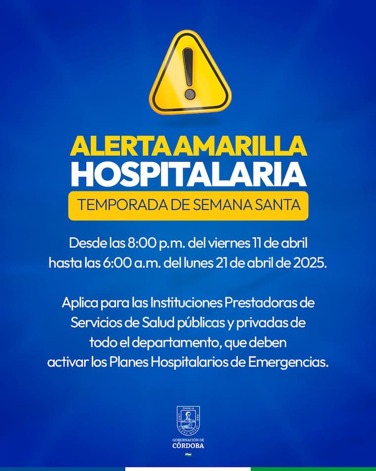 La red pública hospitalaria del departamento de Córdoba, debido a la temporada de Semana Santa que inicia hoy con la celebración de Domingo de Ramos, está en alerta amarilla. Así se mantendrá hasta las 6:00 de la mañana del lunes 21 de abril.