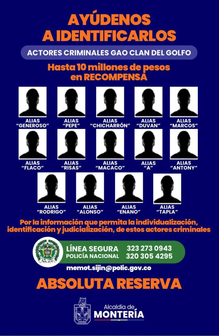 El cartel de los alias del Clan del Golfo que busca la Policía Metropolitana de Montería lo integran: ‘Generoso’, ‘Pepe’, ‘Chicharrón’, ‘Duván’, ‘Marcos’, ‘Flaco’, ‘Risas’, ‘Macaco’, ‘A’, ‘Antony’, ‘Rodrigo’, ‘Alonso’, ‘Enano’ y ‘Tapla’.