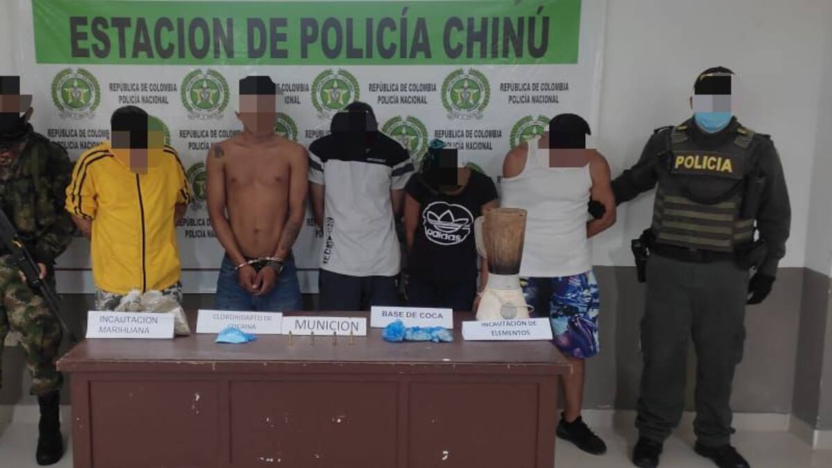 La ofensiva, que fue dada a conocer este jueves 16 de junio, se llevó a cabo en el casco urbano del municipio de Chinú, zona de sabanas de Córdoba, donde además fueron incautados más de 700 gramos de marihuana; 100 gramos de pasta base de coca; 30, de clorhidrato de cocaína; y cuatro cartuchos calibre 38, material que se encontraba en poder de estos sujetos.