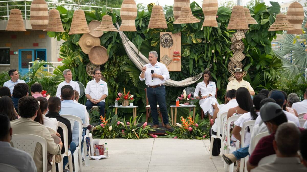 Con la venia de decenas de curiosos que se acercaron para saludarlo, el mandatario nacional alcanzó a llegar a la mesa principal del evento, decorada con plantas ornamentales de la región, productos elaborados a base de caña flecha, mimbre y fique.