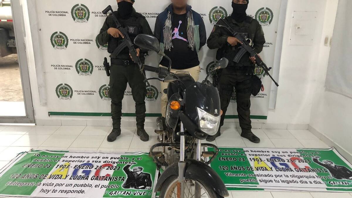 Agregó que 'los uniformados del grupo especial se trasladaron al sector indicado para realizar la respectiva verificación. Estando en el lugar observaron a un hombre, que se movilizaba en una motocicleta, cuyas características físicas correspondían en principio a las descritas por los ciudadanos. En ese momento los policías solicitaron su identificación y le encontraron un bolso tipo canguro que contenía 7 pancartas alusivas al AGC y conmemoración a los 120 años Gaitanistas'.