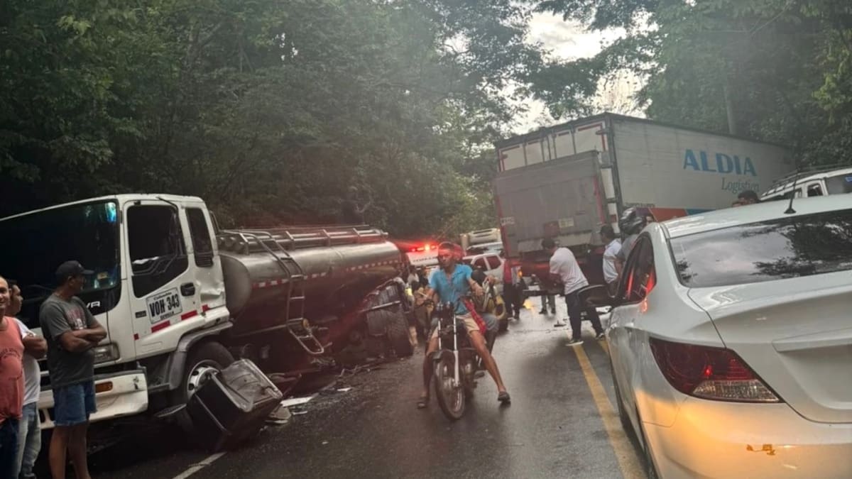 El evento vial involucra a un camión cisterna que transporta gas y a un carro de carga de una cadena de supermercados. Cada uno de estos quedó sobre uno de los carriles.